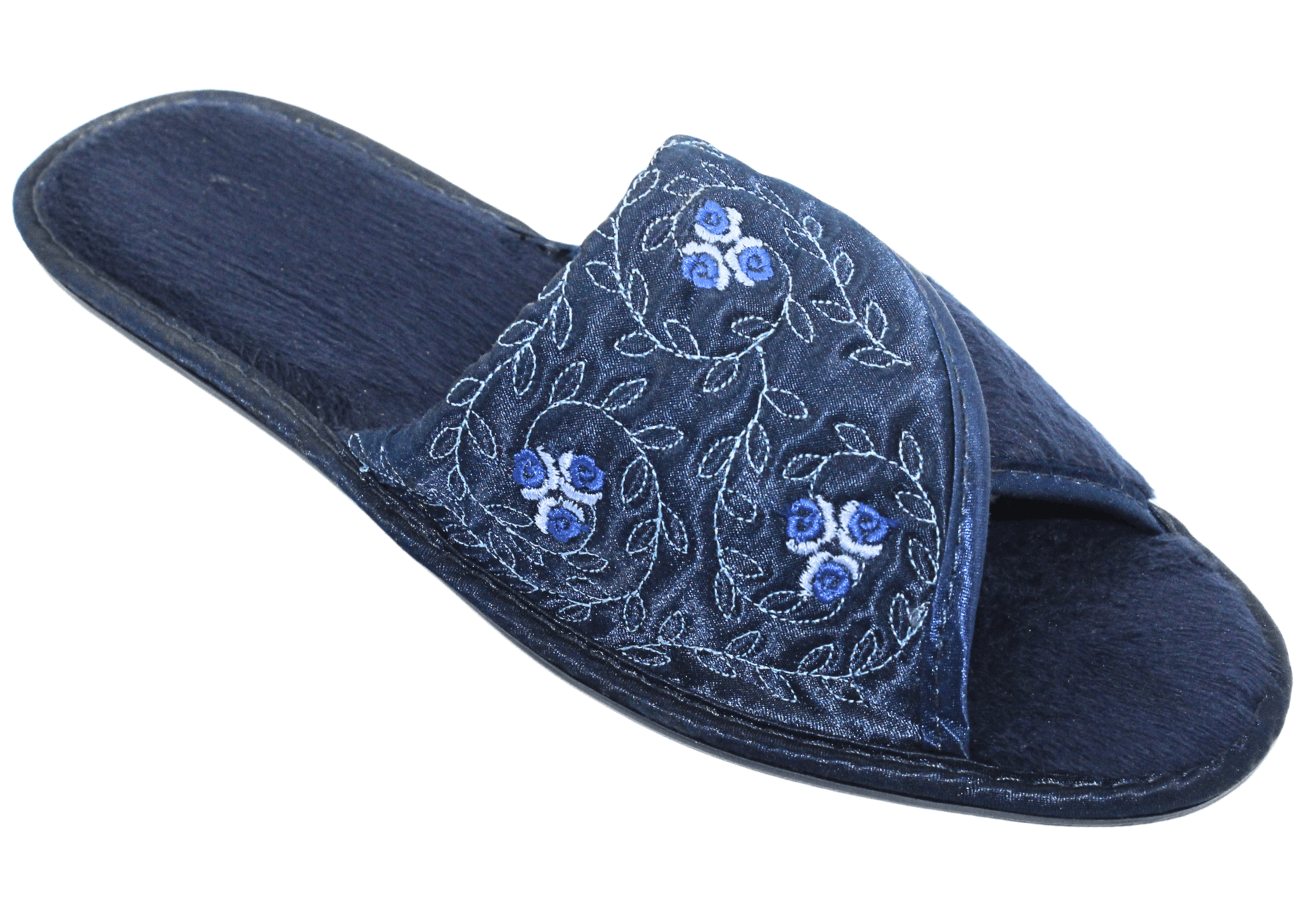 Chic meets cozy in this elegant open-toe slide. Featuring a sophisticated “envelope” strap with intricate floral embroidery, these slippers offer a breathable, feminine fit for effortless everyday lounging. Handcrafted for premium comfort and style.
