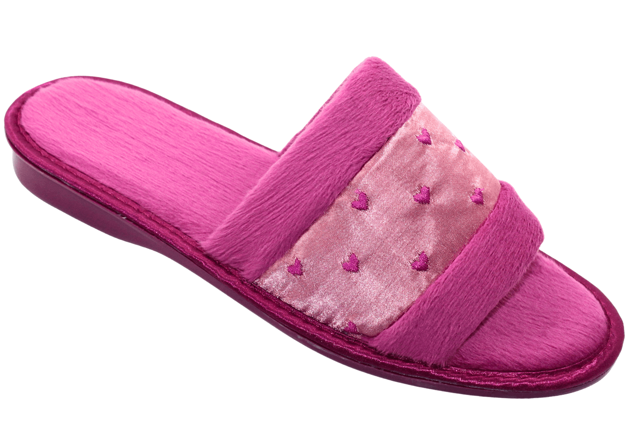 Light pink satin. Fuchsia hearts. Pure romance. This luxurious open-toe design delivers comfort and high style. A captivating detail for your bulk collection.