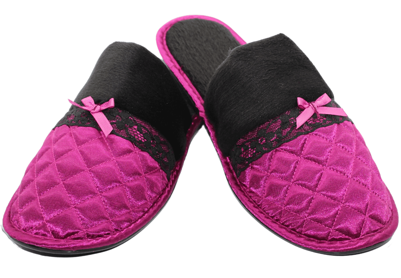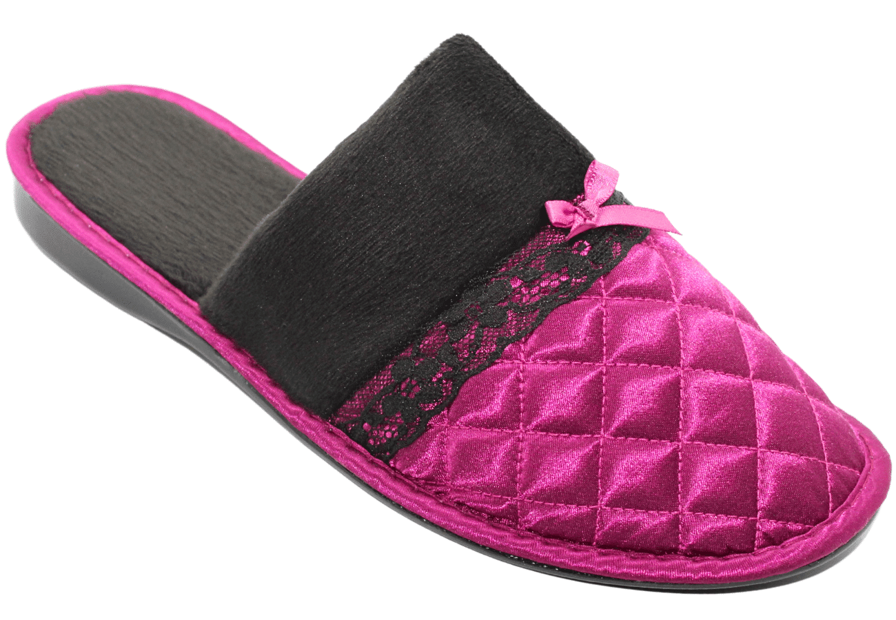 Ladies comfortable satin quilted slippers in beautiful colours. Made with soft velour, a touch of quilted satin & finished off beautifully with a ribbon/lace and bow detail. Step into luxurious style and comfort!